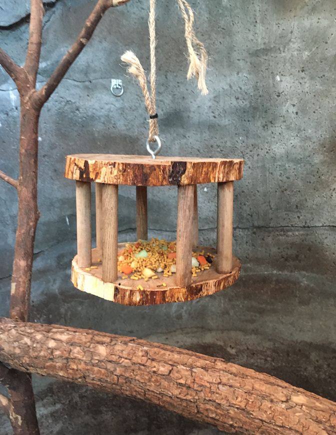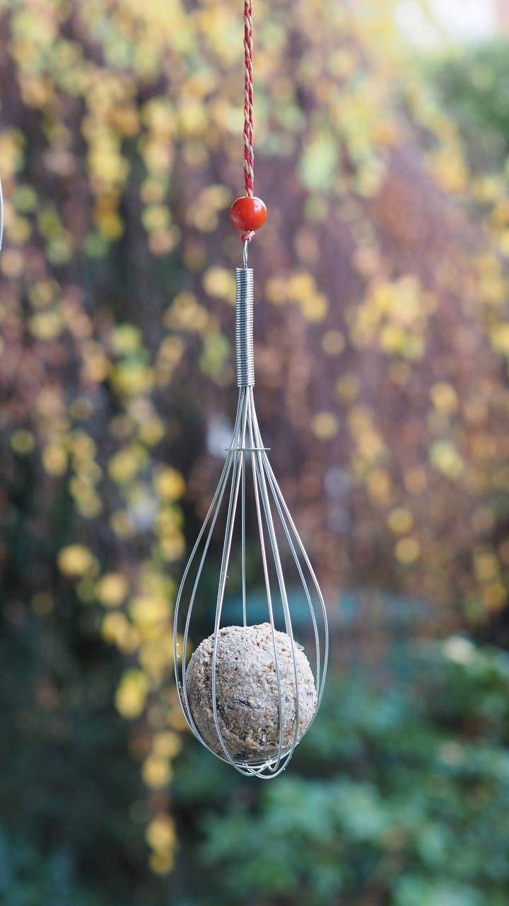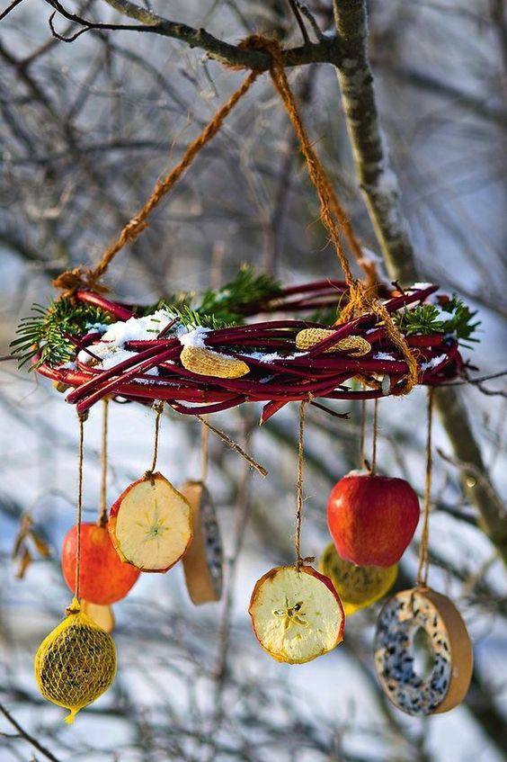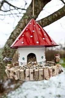 - Une option intéressante est la mangeoire suspendue. Prenez un support, comme du carton, et découpez-y une forme intéressante : une cloche, un cœur, une botte, etc. Percez un trou en haut et passez-y une ficelle. Formez une boucle pour suspendre la mangeoire. Il vous faut maintenant y fixer la nourriture. Assurez-vous que les noix préparées et graines Pour faire adhérer les aliments au carton, il vous faut un liant. Le beurre fera parfaitement l'affaire ! Mélangez les aliments avec le beurre et étalez le mélange sur le carton. C'est prêt !