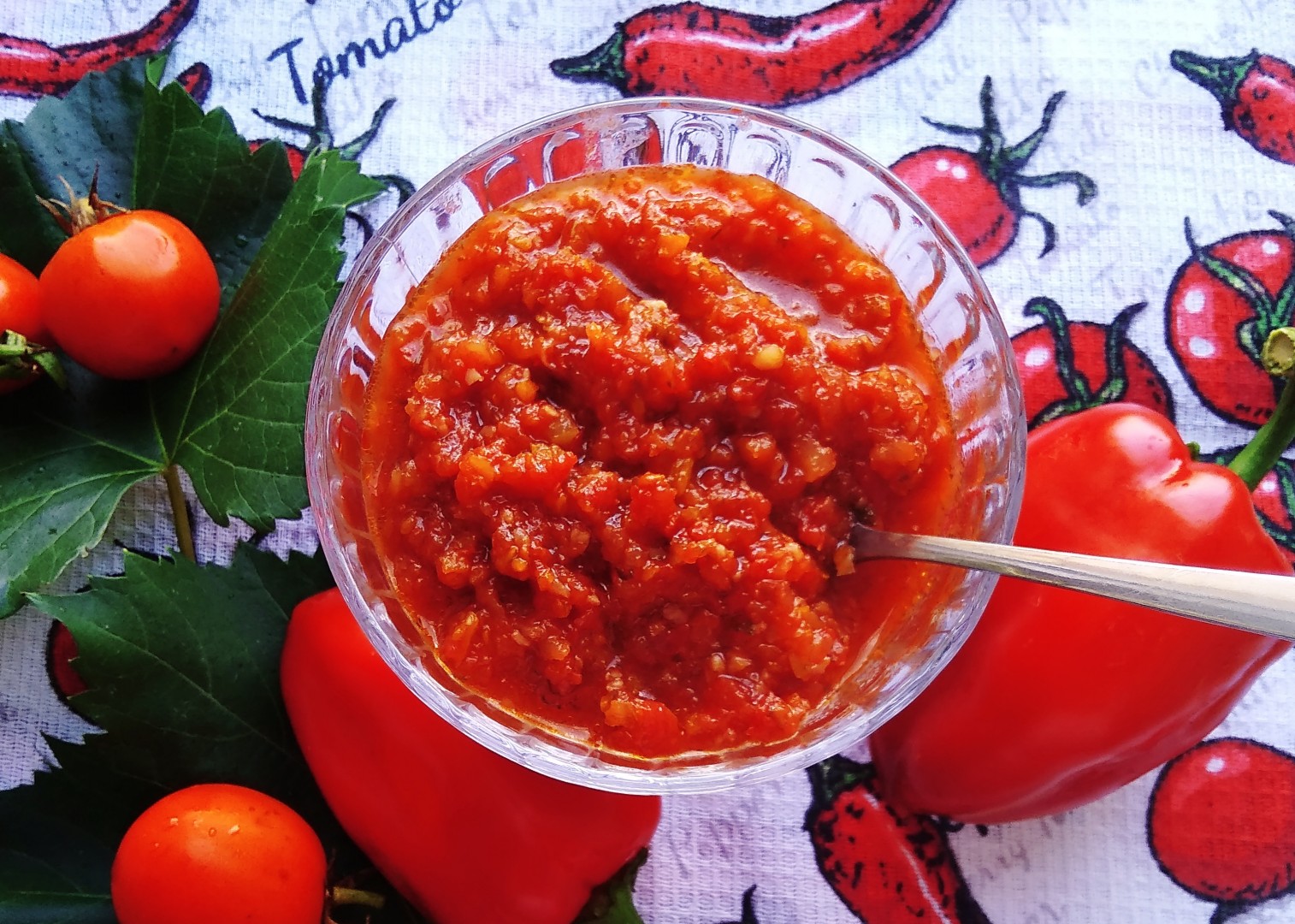 L'adjika peut être préparée avec une grande variété d'ingrédients, comme des tomates, de l'ail, des piments et des herbes aromatiques. L'ajout de 2 ou 3 pommes juteuses confère à ce mélange de légumes une saveur unique, à la fois sucrée et légèrement acidulée.