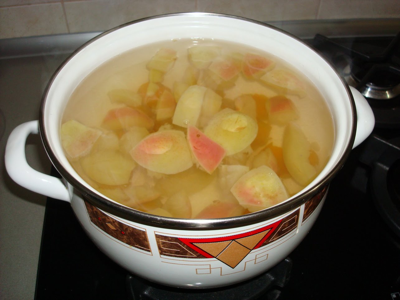 - Plongez délicatement les pommes coupées en dés dans l'eau bouillante, ajoutez le sucre et remuez le liquide jusqu'à ce que le sucre soit complètement dissous.