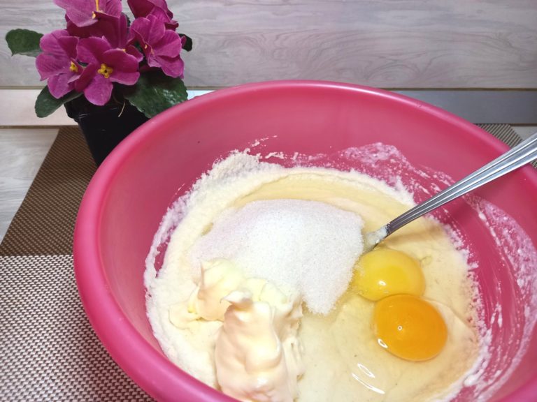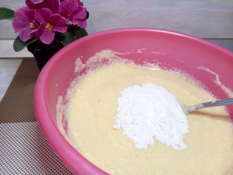 - Ensuite, ajoutez la farine et la levure chimique. Pétrissez jusqu'à obtenir une pâte souple.