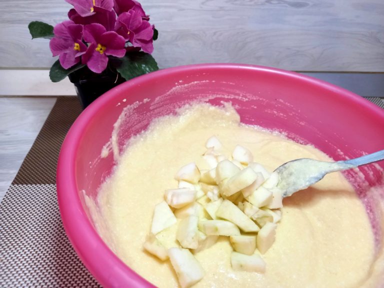 - Pelez et épépinez la pomme, puis coupez-la en morceaux. Ajoutez les fruits à la pâte et pétrissez-les.