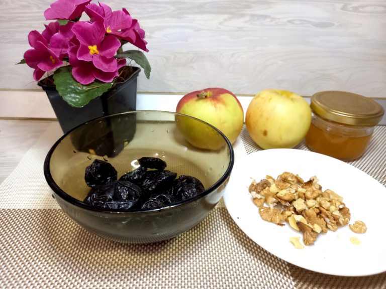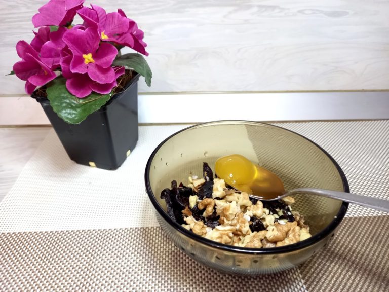 - Transférez les pruneaux dans un bol, ajoutez les noix hachées et le miel, et mélangez le tout.