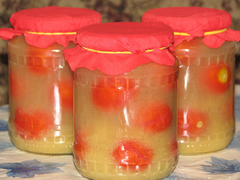 Avec ces ingrédients, on peut préparer des tomates au jus de pomme sans stérilisation, mais avant d'y verser le jus bouillant, il faut procéder à une étape préliminaire consistant à verser de l'eau bouillante et à maintenir le tout pendant 15 minutes.
