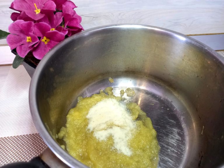 - Transférez la purée obtenue dans une casserole et ajoutez la semoule. Placez la casserole sur feu doux. Laissez cuire, en remuant constamment, pendant environ 6 à 8 minutes.