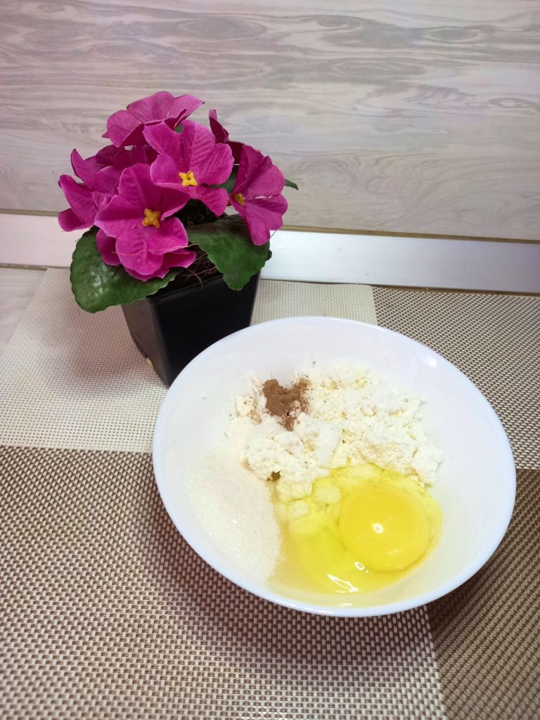 - Faites tremper les raisins secs dans de l'eau chaude et réservez-les. Cassez l'œuf et ajoutez-le au fromage blanc. Ajoutez la cannelle, le sucre et le sucre vanillé. Mélangez bien le tout à la fourchette.