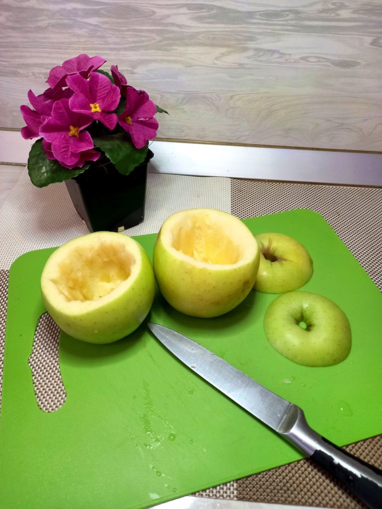 - Rincez soigneusement les pommes à l'eau courante et coupez les queues. Retirez le trognon et presque toute la chair. Façonnez les pommes en forme de coupelles.