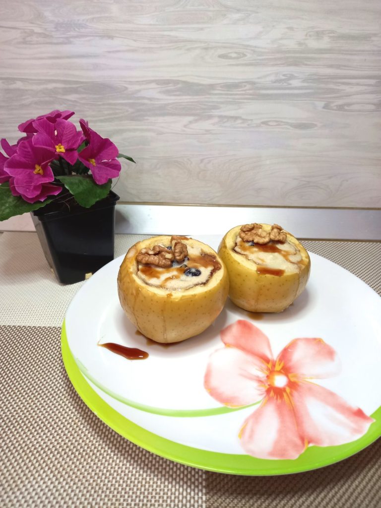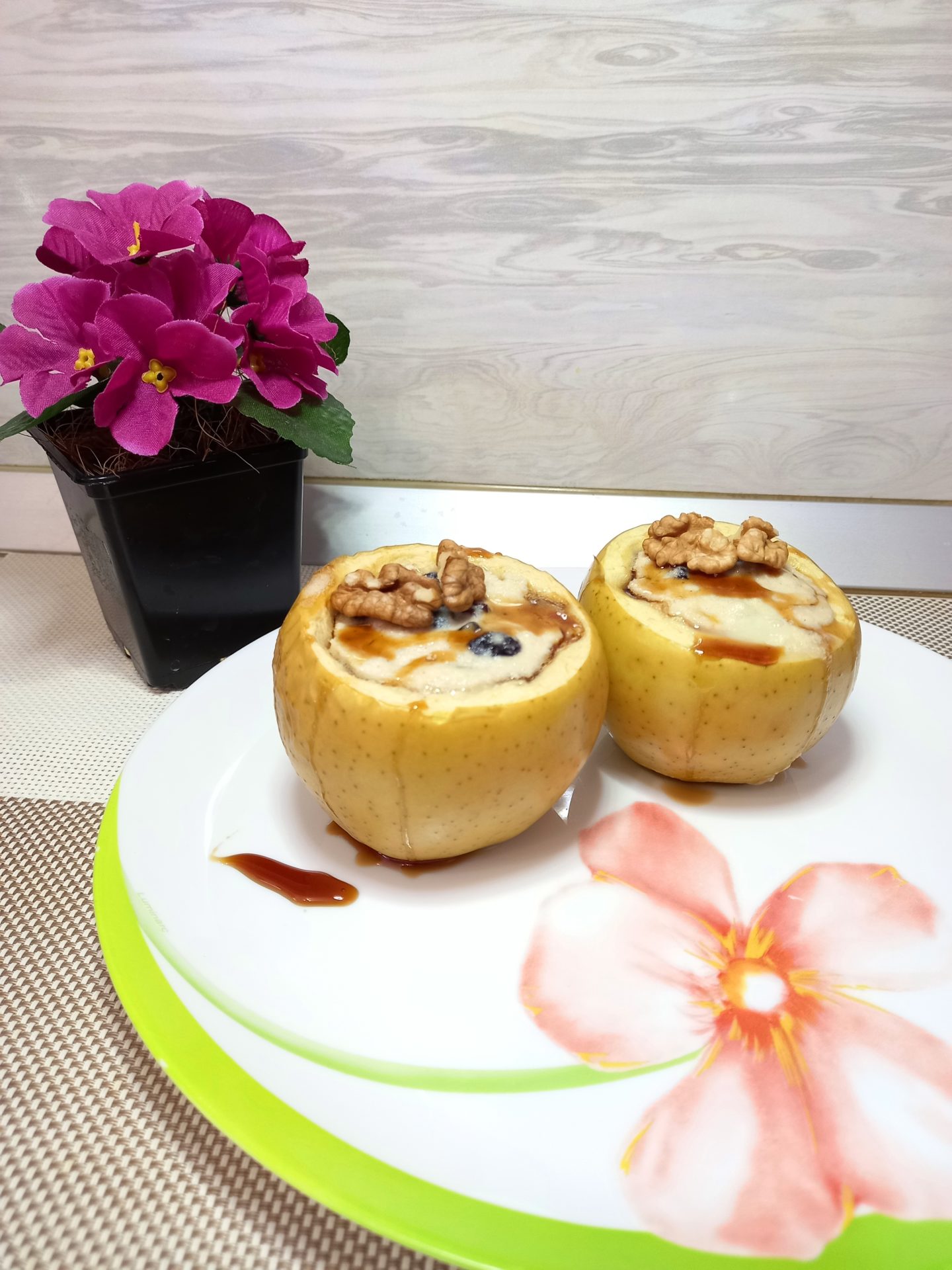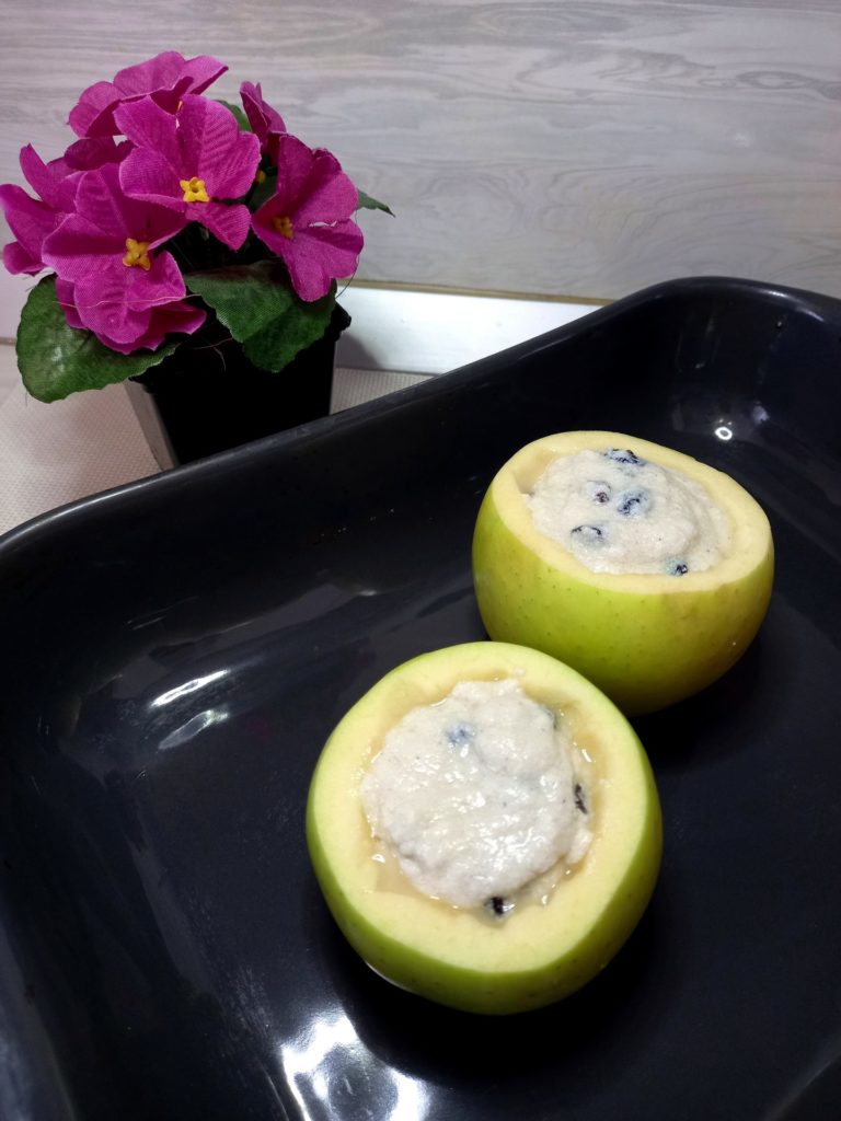 - Étalez la garniture dans les pommes préparées et transférez-les dans un plat allant au four. Faites cuire les pommes et le fromage blanc au four à 180 degrés Celsius pendant 25 minutes.