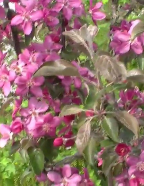 L'Era fleurit plus tard que la plupart des pommiers. Début à mi-mai, de gros bourgeons rouge foncé ou bordeaux apparaissent. À la fin du mois ou début juin, ils s'épanouissent en de magnifiques fleurs d'un rouge carmin éclatant ou d'un rose framboise. Elles recouvrent densément les branches, leurs pétales sont délicats et charnus, et leur parfum embaume les lieux. La floraison dure environ deux semaines, ce qui fait de ce pommier un arbre très ornemental, souvent utilisé dans l'aménagement paysager.