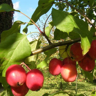 Les fruits sont petits à très petits, atteignant à peine 1 à 1,2 centimètre de diamètre et pesant de 5 à 8 grammes, mais ils peuvent être encore plus petits. Ils sont le plus souvent allongés, mais peuvent aussi être légèrement aplatis, sphériques ou coniques, arrondis et lisses. Leur peau est verte ou vert clair, devenant jaune et parfois dorée à maturité. Elle est dense, résistante et même dure, ce qui la rend difficile à croquer. Les pommes sont recouvertes à 90-95 % d'une teinte rouge vif, cerise ou rouge orangé.