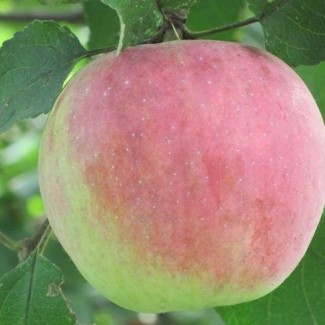 Les fruits atteignent une taille importante, pesant environ 220 à 250 grammes. Ils sont ronds ou ovales-ronds, parfois de forme irrégulière, à surface lisse et légèrement côtelée. Leur peau est lisse, brillante, dense et luisante, verdâtre ou jaune-vert, recouverte à 75-90 % d'une teinte diffuse rose-rouge ou rouge framboise. On n'observe aucun enrobage cireux ou huileux. Les points sous-cutanés sont clairs, grisâtres ou vert clair, nombreux, petits et bien visibles de près. La composition chimique est caractérisée par les indicateurs suivants pour 100 grammes :