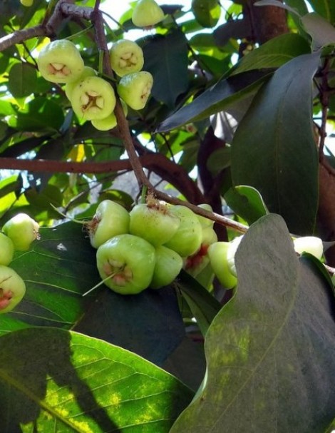 Les fruits du rosier blanc ressemblent peu à des pommes, car la plante elle-même appartient à la famille des Myrtacées. Il s'agit d'arbustes ou de petits arbres, généralement à feuilles persistantes, extrêmement riches en huiles essentielles aromatiques. Les fruits sont typiquement ronds, ovales, oblongs ou piriformes. Ils sont petits, atteignant à peine 4 à 6 centimètres. Leur peau est assez épaisse, brillante à maturité, et peut présenter une teinte verdâtre, blanche, rose, pourpre, voire rouge vif.